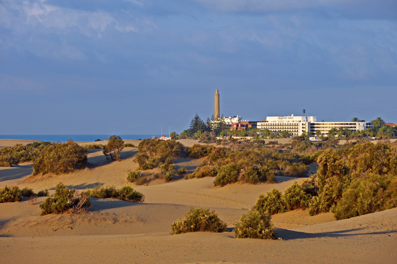 The Dunes beach and luxury hotels under palm trees – the Maspalomas Oasis & Faro area is visually the most impressive and recognized resort on this Canary Island. A Maspalomas Dunes picture is the locally most elected postcard theme, embodyment & proof for vacations in Gran Canaria and therefore justly the most favored destination at Gran Canaria's south coast "Costa Canaria". For Travelers with accomodation in other resorts it is almost mandatory to visit the Faro Lighthouse and the coastline of the Maspalomas dunes beach within an excursion or daytrip.